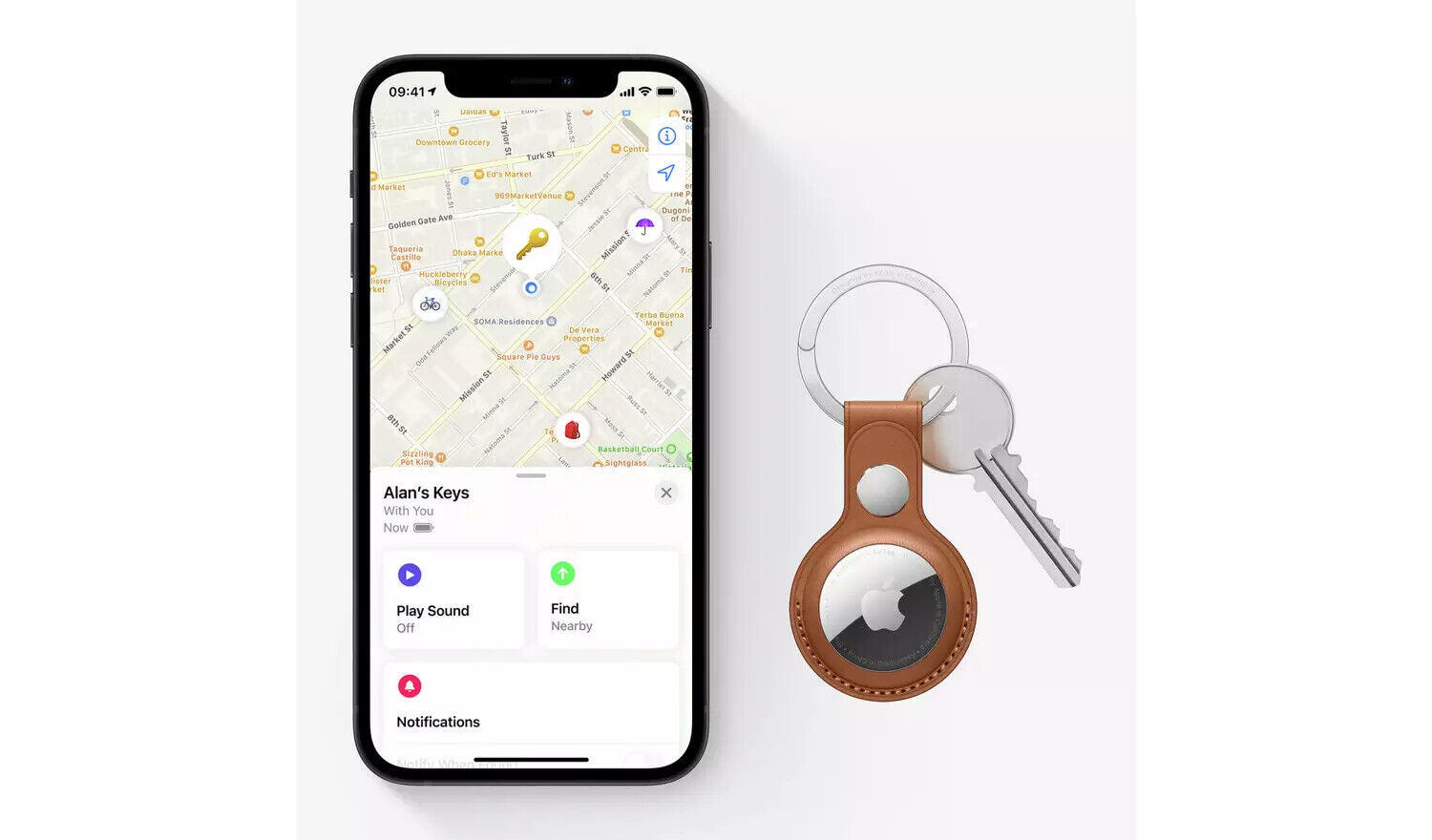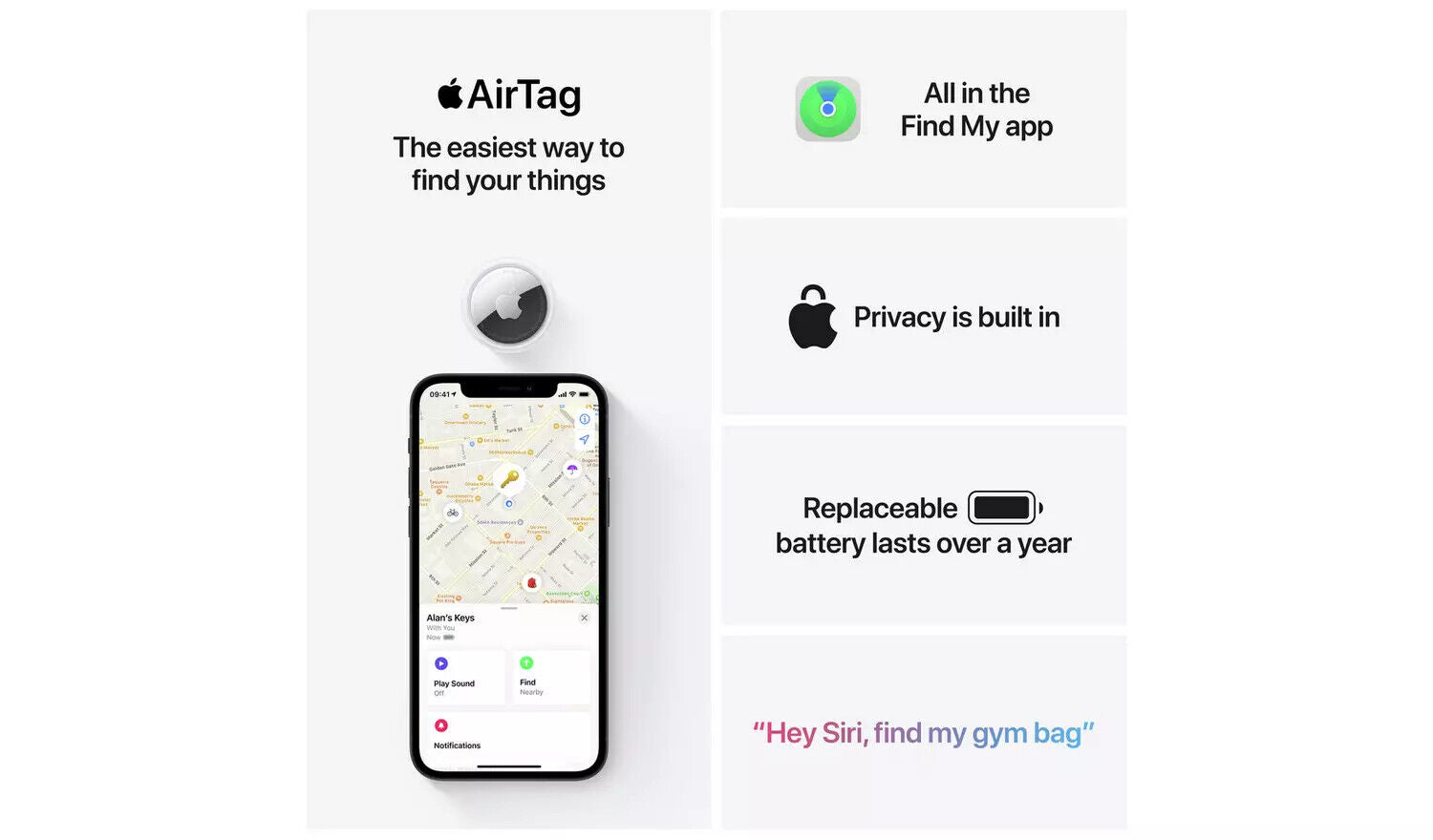 AirTag is the super-easy way to keep track of and find your things. Attach one to your keys or slip another one into your backpack. And just like that, they're on your radar in the Find My app. Keep track of your keys, wallet, luggage, backpack and more, all in the Find My app. Play a sound on the built-in speaker, or say Hey Siri, find my gym bag.