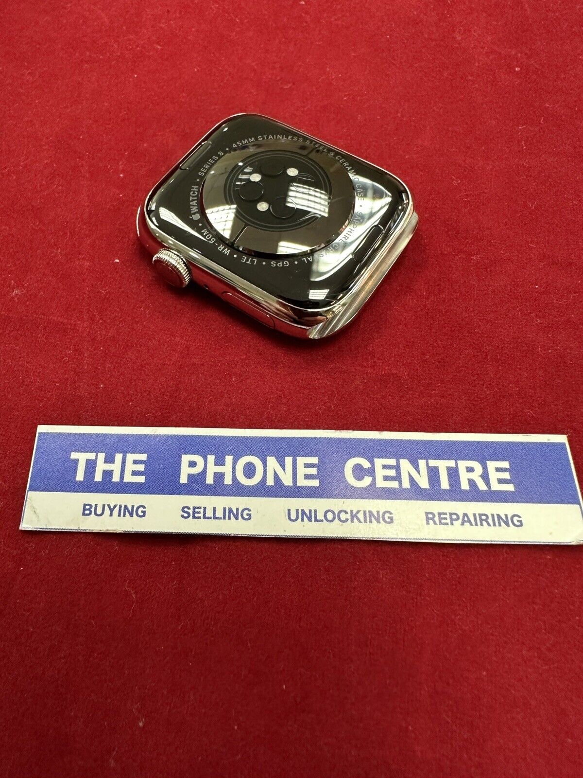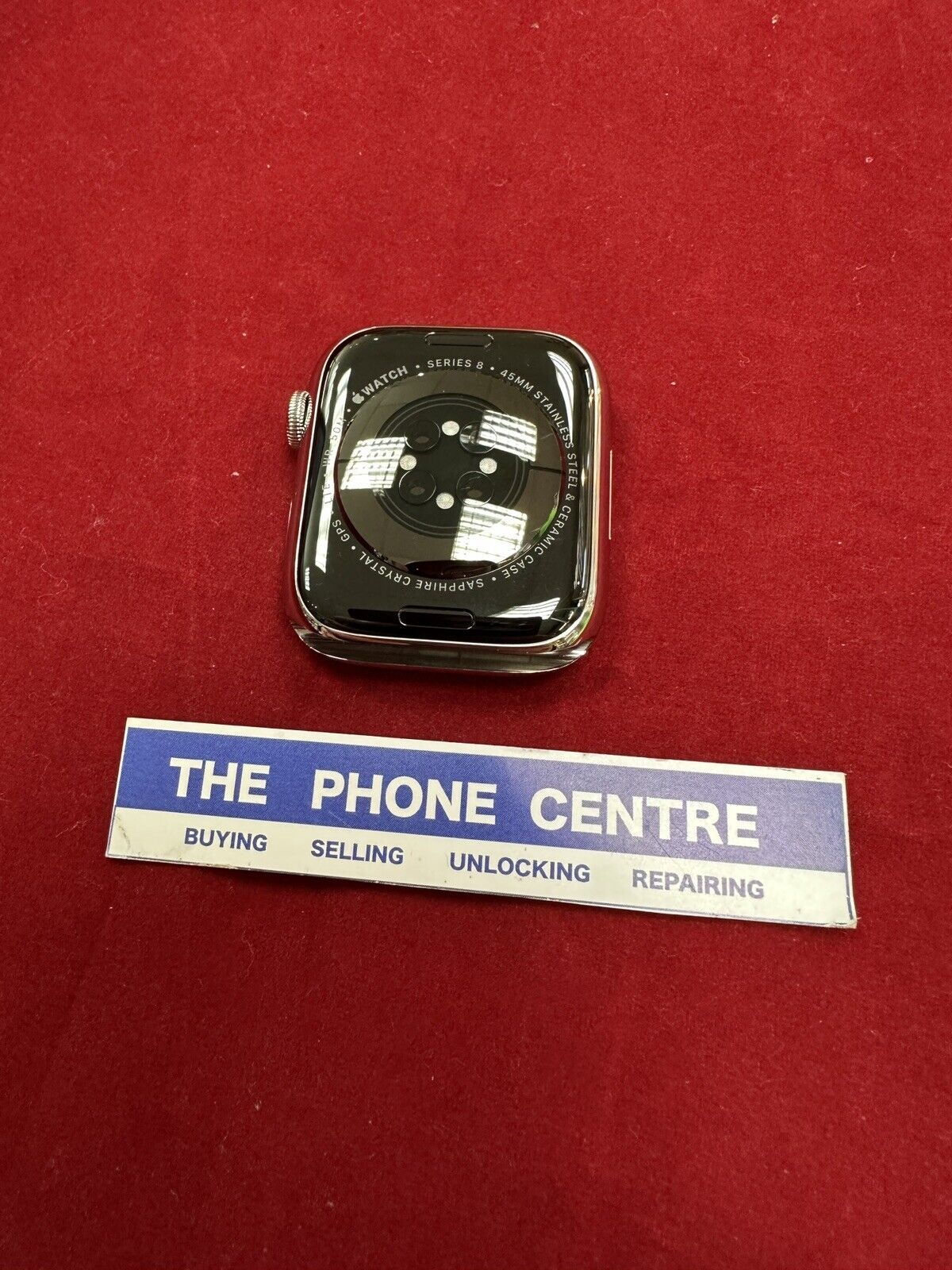 This item is - Apple Watch Series 8 GPS CELLULAR 45mm Silver Stainless Steel Case 100% Battery