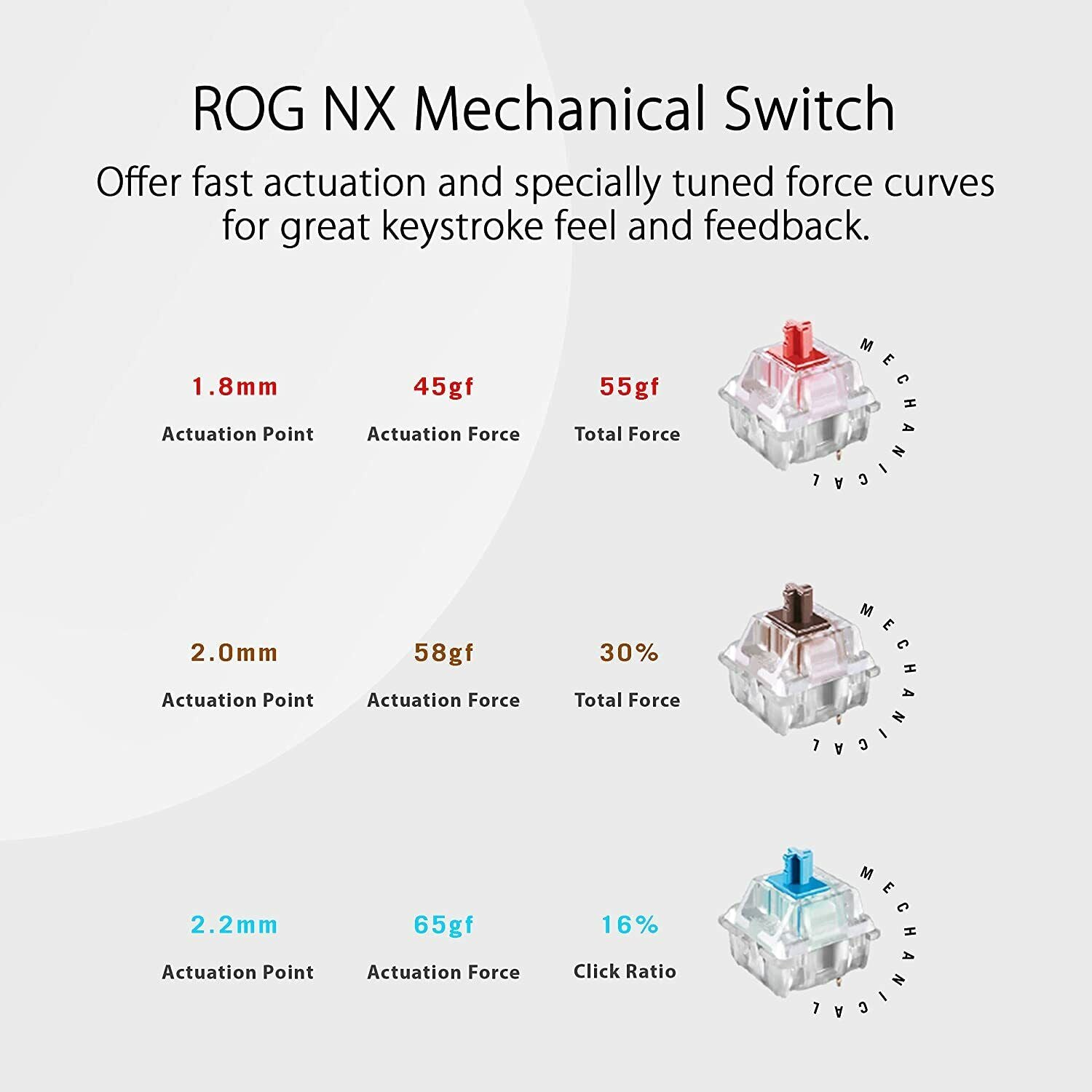 - ROG Exclusive Gaming Switch - ROG NX Mechanical Switch, fast actuation with ROG-tuned power curves for great key feel and feedback