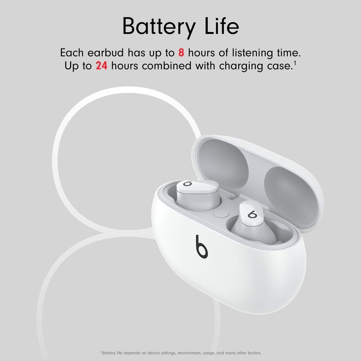 - Up to 8 hours of listening time (up to 24 hours combined with pocket-sized charging case)