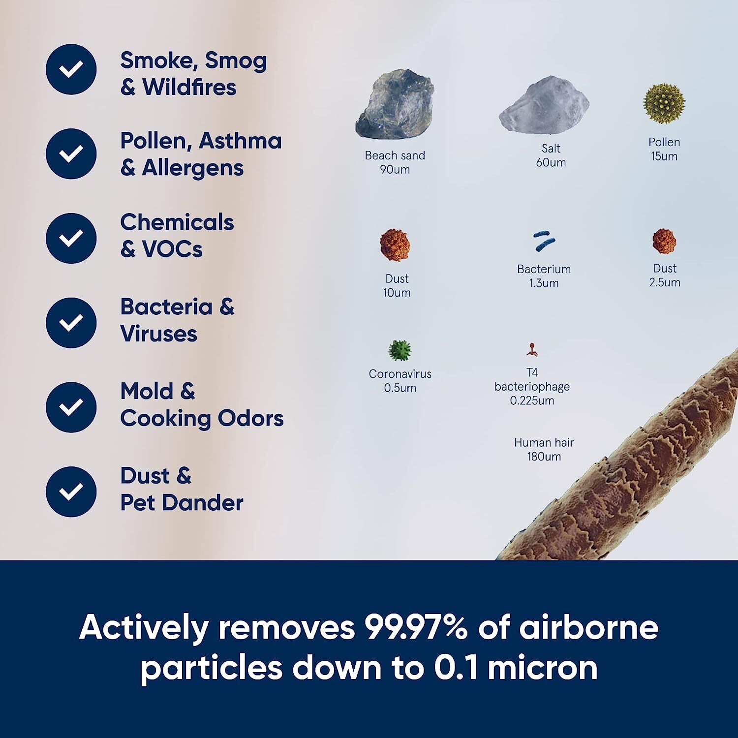 - EFFICIENT 3 STAGE FILTER: Removes 99.9% of airborne particles down to 0.1 micron size, such as viruses, bacteria, smoke, dust and pet dander. The carbon filter traps light household odours from smoking, pets and cooking