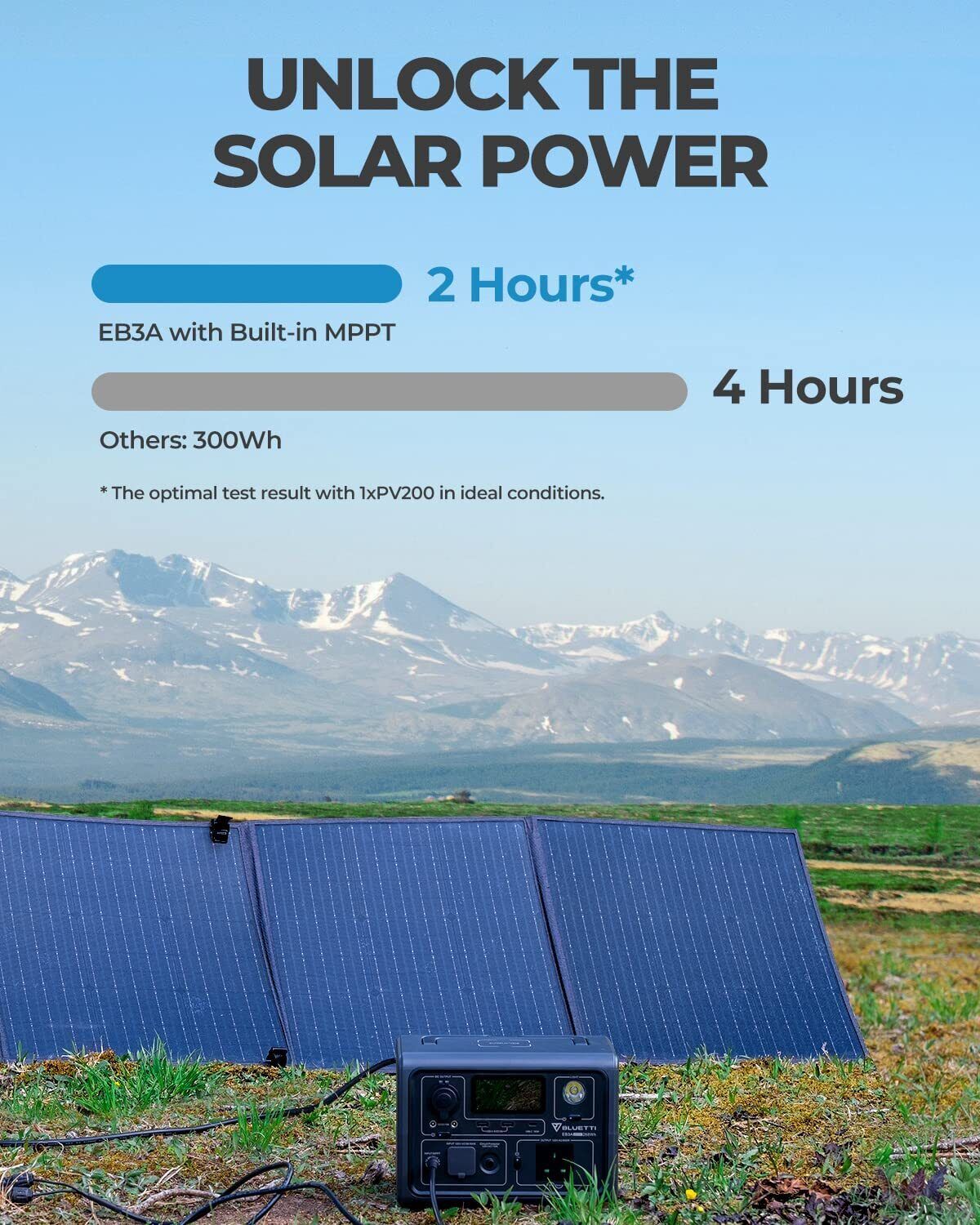 - [Harness the Power of Sun] - The built-in MPPT controller supports up to 200W of solar input, enabling you to make an ideal solar generator with BLUETTI PV120/PV200 solar panel.
