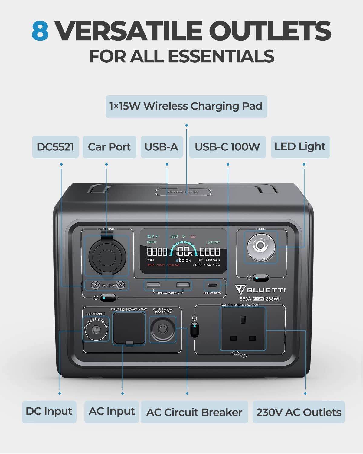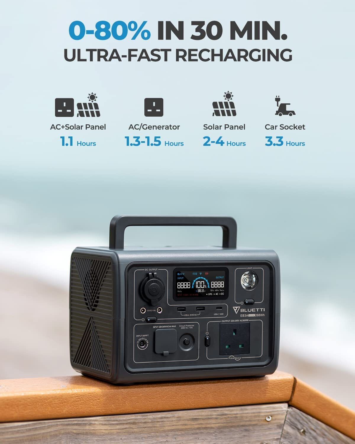 This item is - BLUETTI Portable Power Station EB3A, 268Wh LiFePO4 Battery Backup w/ 2 600W (1200W Surge) AC Outlets, Recharge from 0-80% in 30 Min., Solar Generator for Outdoor Camping (Solar Panel Optional)