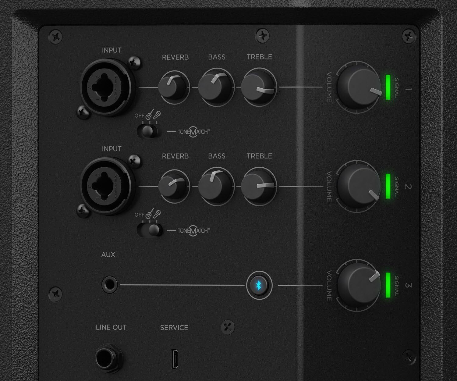 - Wireless Bluetooth pairing and inputs for a microphone or musical instrument such as a keyboard or guitar
