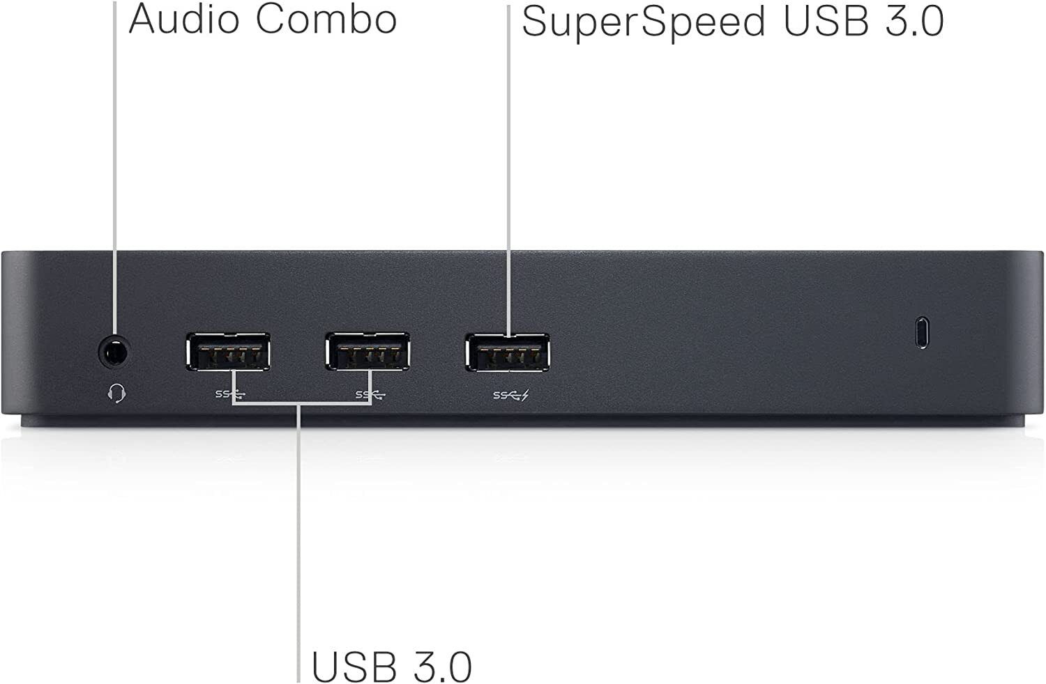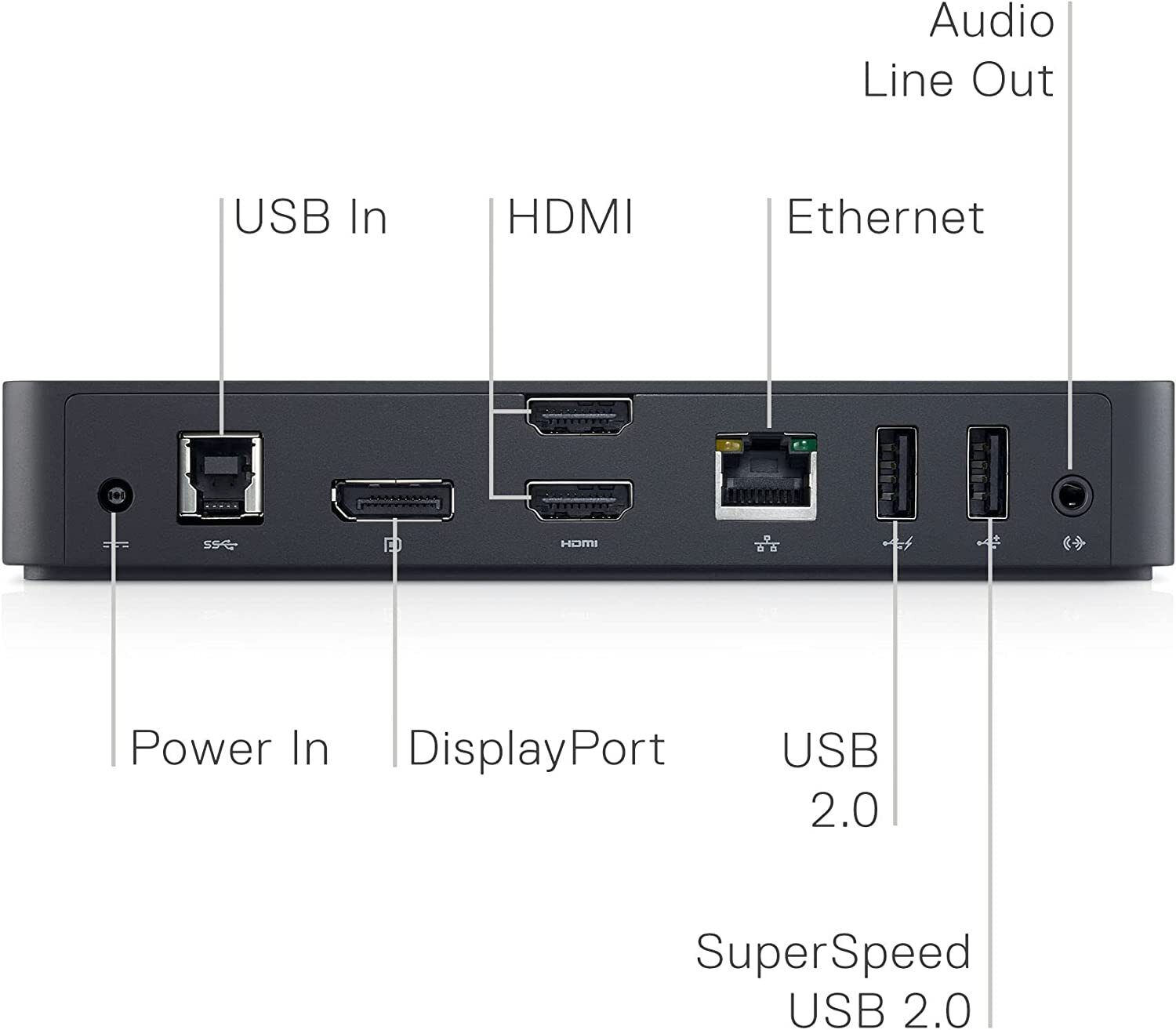 - Dell Docking Station - USB 3.0 connects your laptop to up to three additional monitors, various external devices and the Internet with a single cable. It features a convenient way to expand the capabilities of your portable PC and customize your desktop computing environment. Compatibility: Interfaces 2 x USB 2.0 - 4 pin USB Type A 3 x SuperSpeed USB 3.0 - 9 pin USB Type A 2 x display / video - HDMI - 19 pin HDMI Type A 1 x display / video - DisplayPort - 20 pin DisplayPort 1 x network - RJ-45 1 x headphones - output - mini-phone 3.5 mm 1 x audio - output - mini-phone 3.5 mm 1 x SuperSpeed USB 3.0 - 9 pin USB Type B