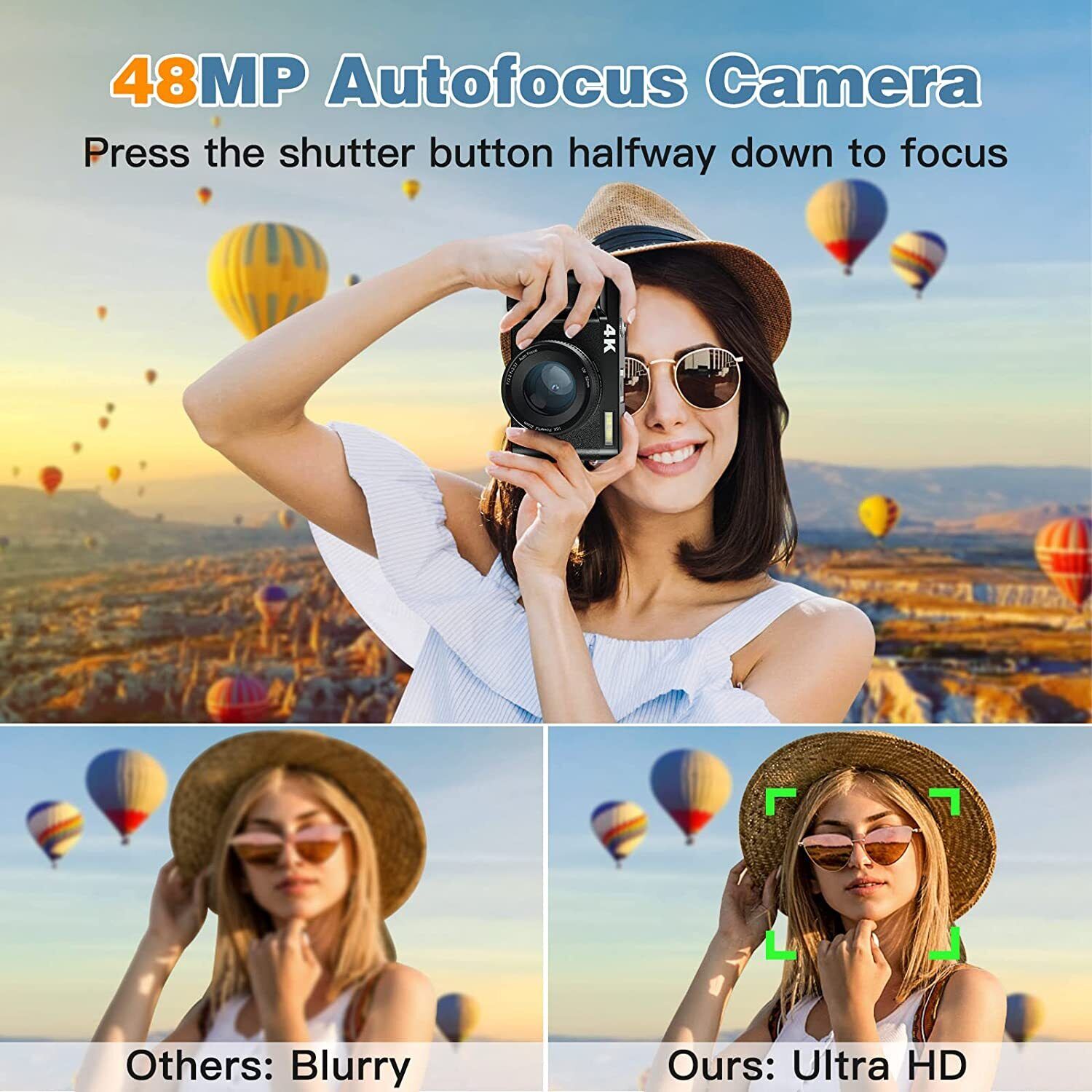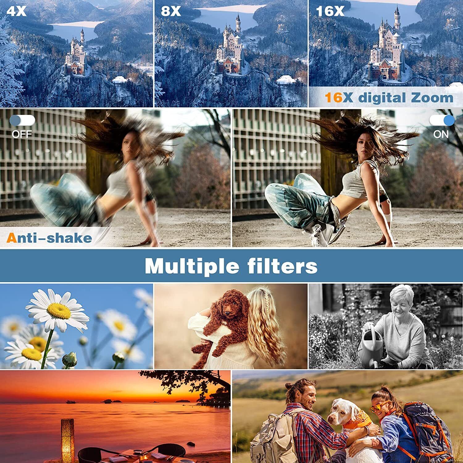 - 【48MP Super HD Photography with Autofocus】The digital camera for photography has a 48MP image resolution and an 8MP CMOS image sensor. Autofocus and anti-shake features make this digital camera for beginners who want to quickly take HD photos, take HD text or portraits up close without much work, and the 16x zoom photography camera can also shoot landscapes with clarity from a distance.