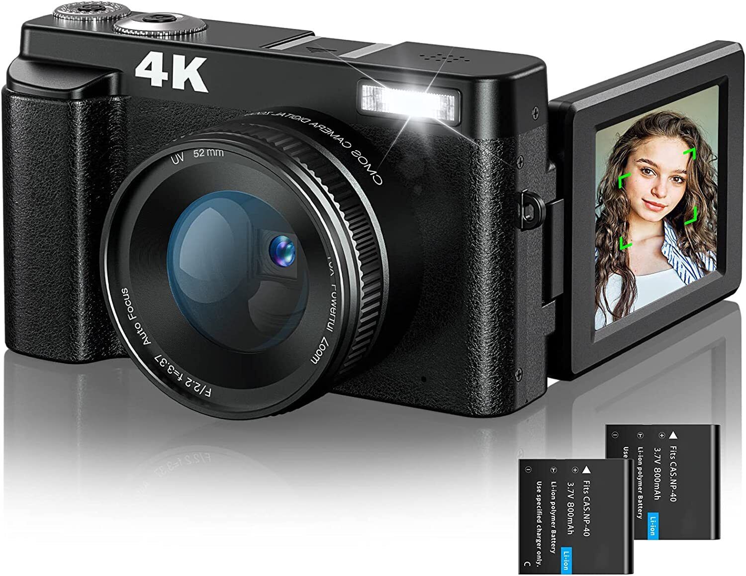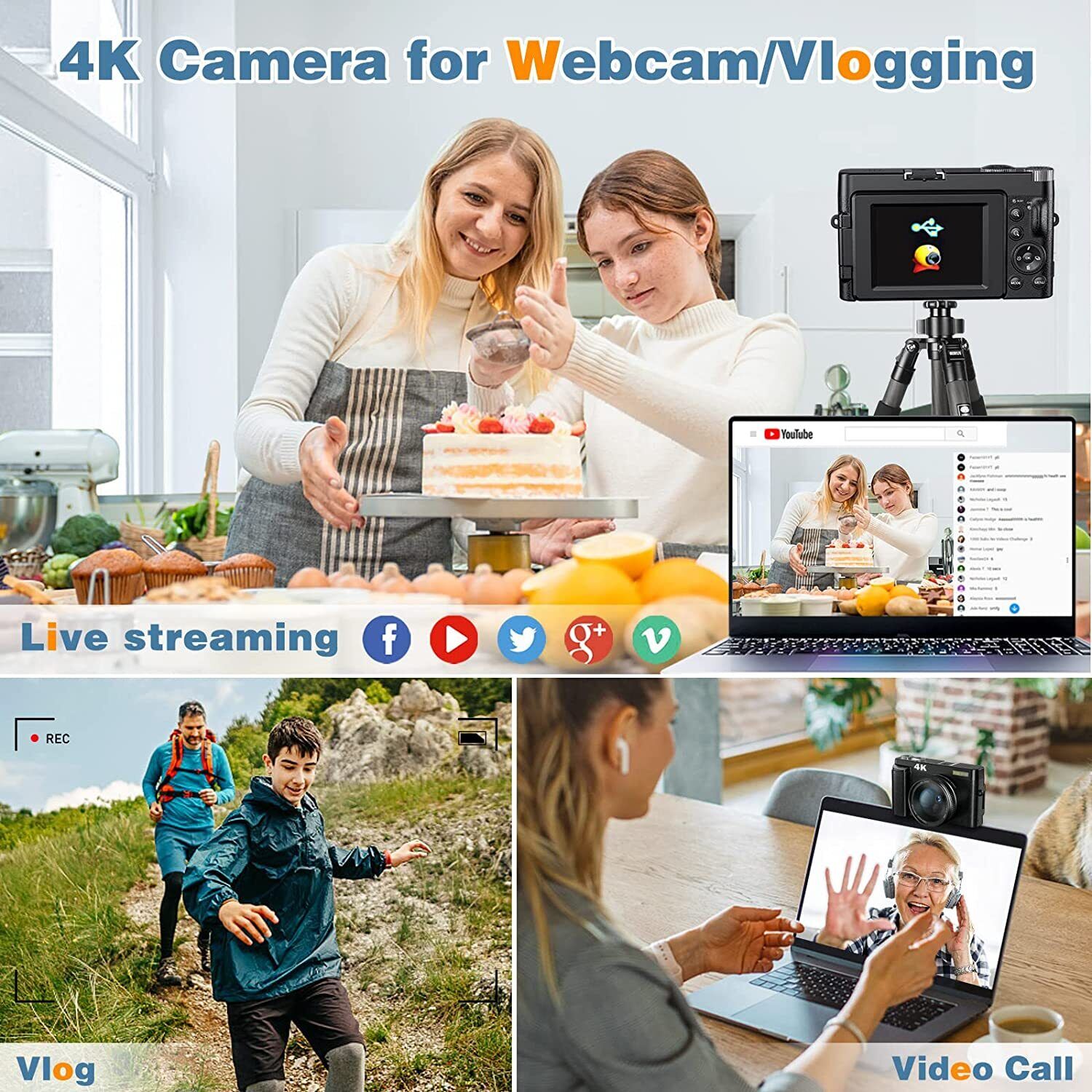 - 【4K Super HD Video Creation】The 4K digital camera delivers a high bit rate of 30FPS without missing all details, video camera's pause helps save editing time and memory, and time-lapse and slow-motion features create the creativity you want! In addition, the vlogging camera for YouTube can as a webcam, letting you easily do live streaming or video calls on YouTube, Facebook, Twitter, or other social media.