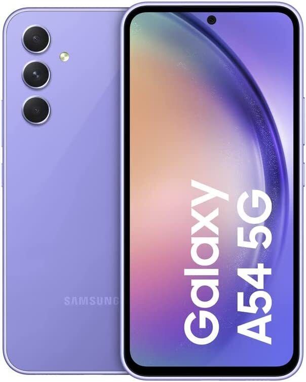 Samsung Galaxy A54 5G . Display diagonal: 16.3 cm (6.4"), Display resolution: 2340 x 1080 pixels, Display type: SAMOLED. RAM capacity: 8 GB, Internal storage capacity: 256 GB. Rear camera resolution (numeric): 50 MP, Rear camera type: Triple camera. SIM card capability: Hybrid Dual SIM. Battery capacity: 5000 mAh. Product colour: Violet. Weight: 202 g